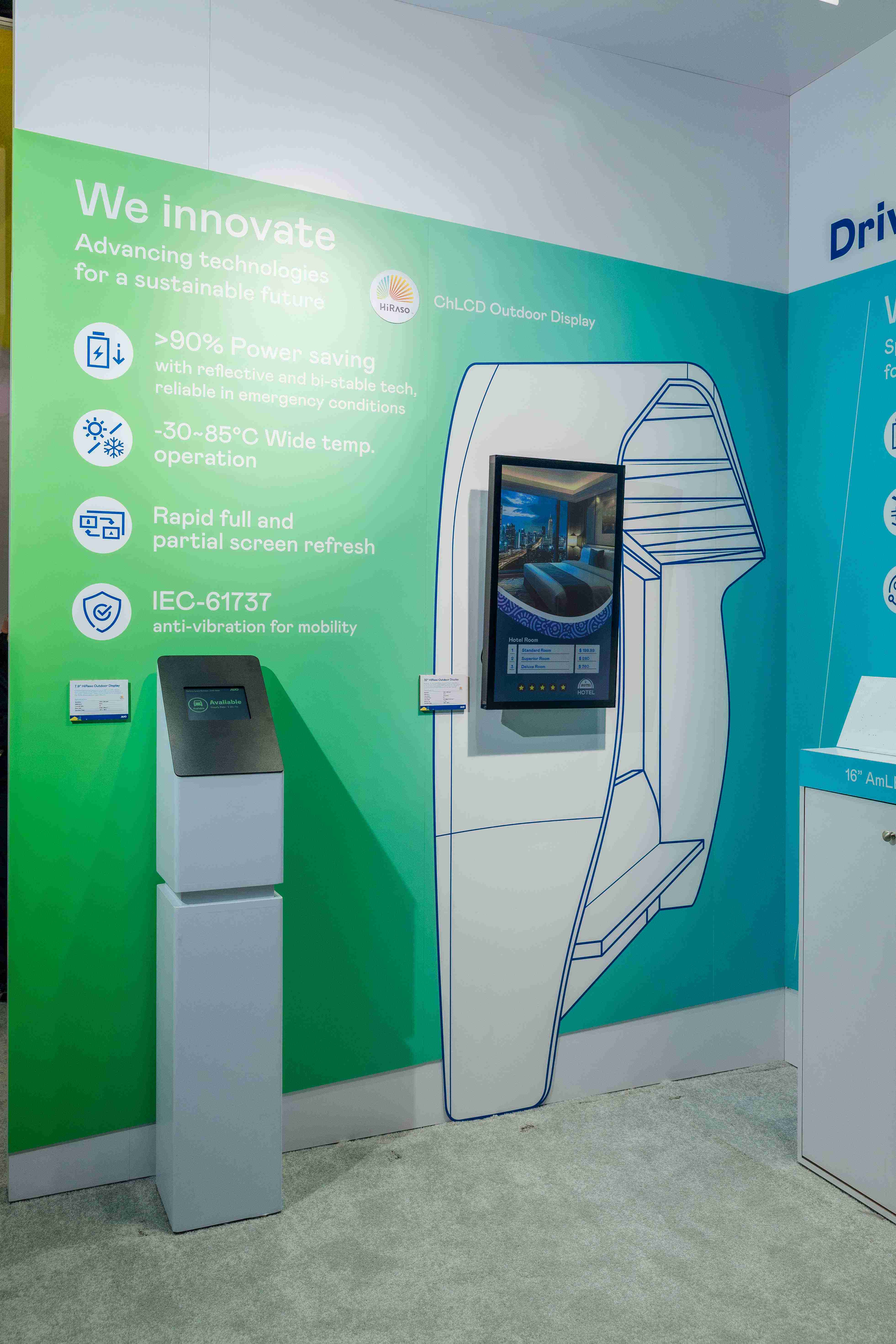 HiRaso胆固醇液晶显示器运用反射环境光线的方式,,,呈现影像显示时零耗能的环保省电诉求,,光线愈强愈能呈现绝佳的色彩饱和度及显示效果,,,,同时在摄氏-30度至85度间宽温的使用优势,,,为户外电子看板的新首选。。