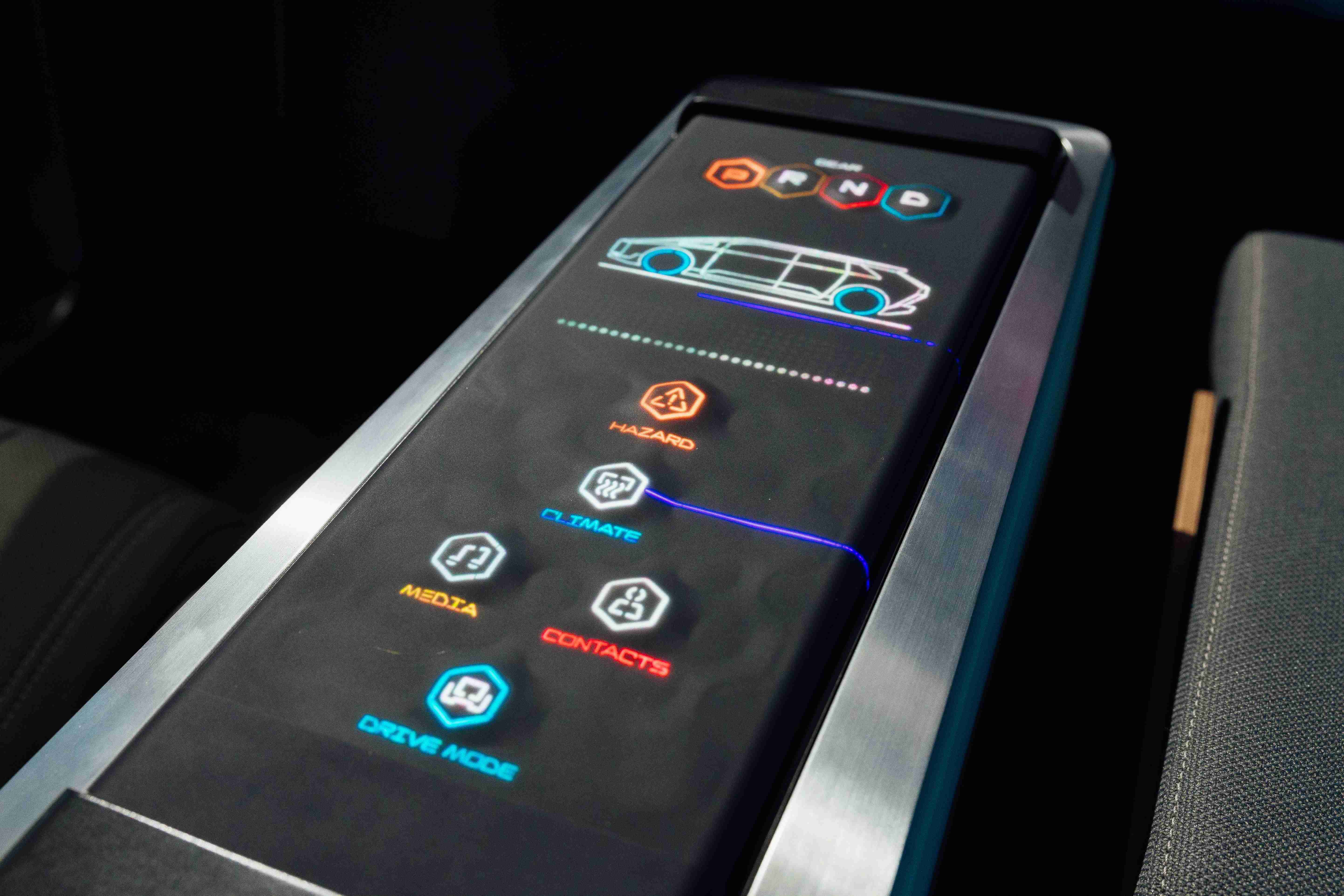 幻境全景天幕(Virtual Sky Canopy)将无缝拼接大型化的透明Micro LED显示器融入至天窗,,带来沉浸式体验,,,,将人机介面扩展至整个座舱。。。。 2468BET光电以人性化的设计引领直觉式的人机互动,,透过多变形态中控显示(Morphing Center Control)、、、、隐藏式智驾介面(Foldable Cruise Pilot)等解决方案,,让乘用者依据自身需求调整、、、控制座舱内所需功能。。。。