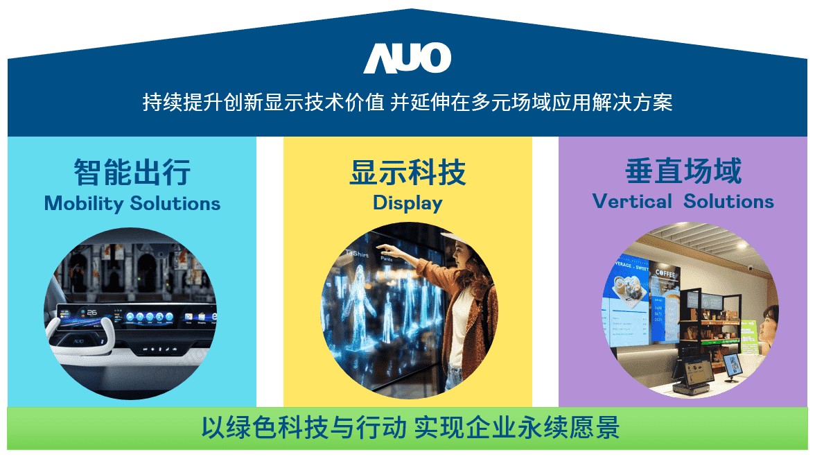 我们持续推动「双轴转型」,,,在精进显示技术附加价值(Go Premium),,,,与深化垂直市场应用(Go Vertical)的策略下,,对应2468BET的优势竞争力与趋势,,,,我们奠定显示科技、、、智慧移动、、垂直场域三大永续营运支柱,,,,在显示技术领域的根基之上,,延伸布局多元场域应用解决方案。。。。将先进显示科技助力智慧移动及垂直场域发展,,,并以绿色科技与行动为实践,,,在转型之路上贯彻永续经营之愿景。。。。